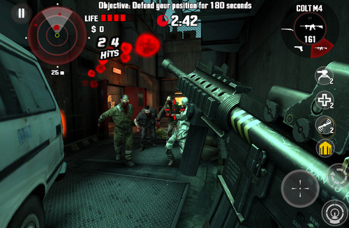 游戏操作采用虚拟摇杆及按键,直接利用准星瞄准射击。同时游戏中的近战不能是玩家主动,只有等到僵尸扑上来才行进行戳眼睛并拧断脖子