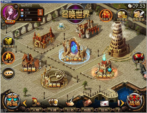 玩家每天登录后首先进入的会是主城场景,主城场景可以通向所以游戏中的系统,包括单机推图的战场,合作挑战的多人副本,玩家相互对战的竞技场。