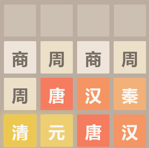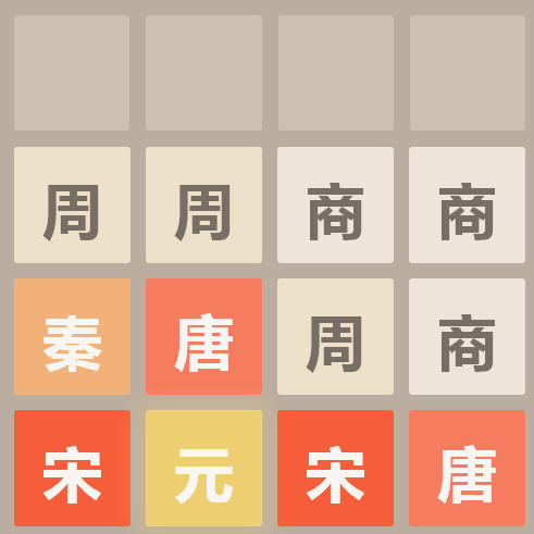 2048朝代版玩法和2048数字版一样,可以选择上下左右其中一个方向去滑动,不同的是将数字变成了中国自夏开始的各个朝代,就是两个夏拼成一个商,两个商拼成一个周...每次碰撞后便生成下一个朝代,以此类推直到中华人民共和国完成通关。